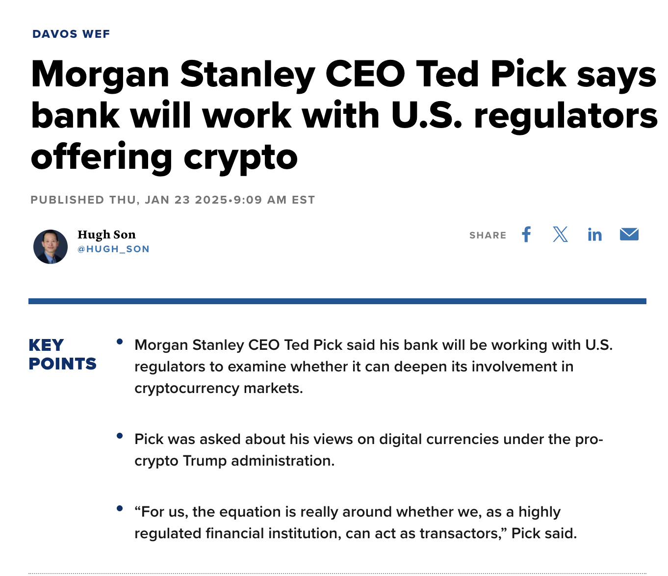 - 모건스탠리의 신임 CEO 테드 픽이 세계경제포럼(WEF·다보스포럼)에 참석해 미국 규제 당국과 협력해 암호화폐 시장에 더 깊이 관여할 수 있는지 검토할 방침이라고 밝혔습니다.