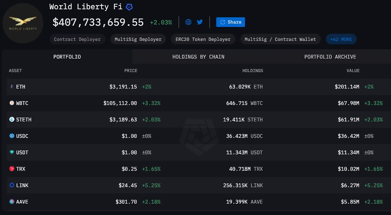 월드리버티파이낸셜은 이더리움(ETH), 랩트비트코인(wBTC), 트론(TRX), 체인링크(LINK), 에이브(AAVE), 에테나(ENA), 온도파이낸스(ONDO) 등 다양한 가상자산을 보유하고 있습니다.