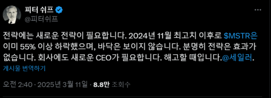 마이크로스트래티지의 주가가 최근 몇 달간 55% 이상 하락하고 비트코인 가격이 7만9000달러로 떨어지면서 경제학자 피터 시프가 회사의 비트코인 중심 전략에 대해 강하게 비판했다. 그는 회사