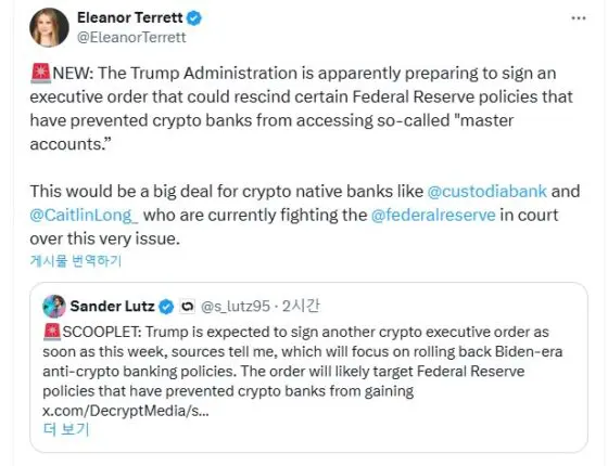 미국 트럼프 행정부가 암호화폐 은행의 연방준비제도(Fed) '마스터 계좌' 접근을 제한해 온 정책을 철회하는 행정명령을 준비 중인 것으로 알려졌다. 폭스 뉴스 기자 엘리노어 테릿은 10일(현지