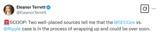 미국 증권거래위원회(SEC)와 리플(Ripple) 간의 소송이 마무리 단계에 접어들었고 조만간 종료될 것이라고 폭스 비즈니스의 엘리노어 테렛 기자가 12일(현지 시간) 밝혔다. 그녀는 이날 X(옛 트위