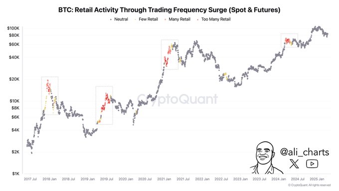 비트코인(BTC)이 7만 달러에서 11만 달러까지 상승하는 동안, 소매 투자자의 활발한 거래 활동은 감지되지 않았다. 이는 과거 주요 고점 형성과는 다른 양상이라고 유명 분석가 알리 마르티네즈가