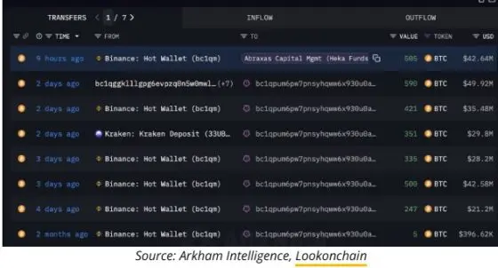 - 비트코인 대규모 매입: 아브락사스 캐피털은 최근 4일 동안 2억 5000만 달러 상당의 비트코인 총 2949개를 매입했습니다. 특히 지난 18일에는 바이낸스에서만 4500만 달러어치를 구매한 것으로 나타났습니다.