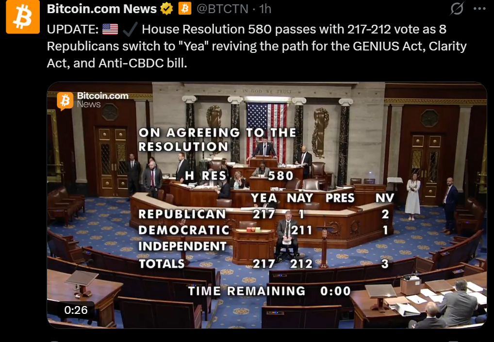 美 하원, 지니어스법안 절차표결 통과… 트럼프 “디지털 자산은 미래, 미국이 세계 이끈다” |