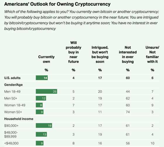 미국에서 디지털자산(가상자산)에 대한 개인 투자자들의 태도는 여전히 조심스러운 것으로 나타났다. 26일(현지시각) 미국 여론조사기관 갤럽의 조사에 따르면 미국 성인 중 디지털자산을 보유