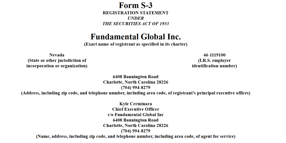 - 미국 투자사 펀더멘털 글로벌(Fundamental Global Inc., 나스닥: FGF)이 SEC에 S-3 양식 제출