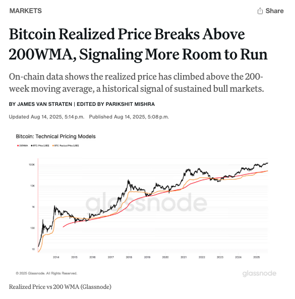 - 비트코인 실현 가격이 **200주 이동평균선(이평선)**을 상회