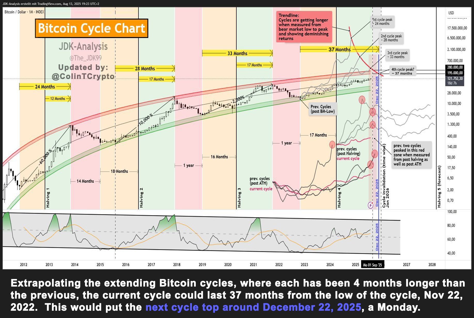 - 브랜트가 동의한 비트코인 사이클 차트는 2011년 이후 4번의 주요 주기를 정리한 것