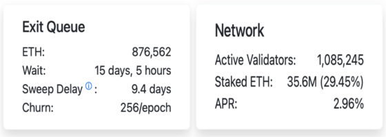 이더리움(ETH) 스테이킹 해제 대기 물량이 사상 최대를 기록하며 출금 대기 기간이 15일에 달했다. 15일(현지시각) 밸리데이터큐(ValidatorQueue)에 따르면 출금 대기 중인 ETH는 87만7600개를 돌파했다.