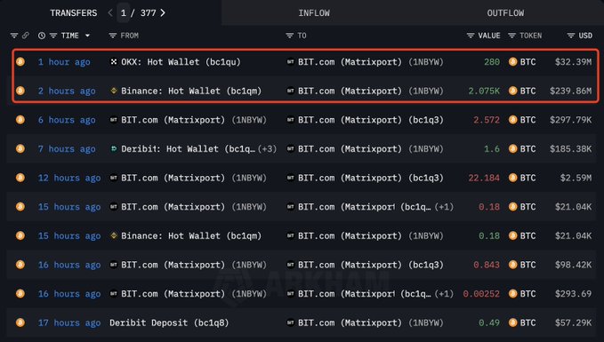 - 매트릭스포트 연계 지갑이 바이낸스와 OKX에 총 95,873 ETH 입금