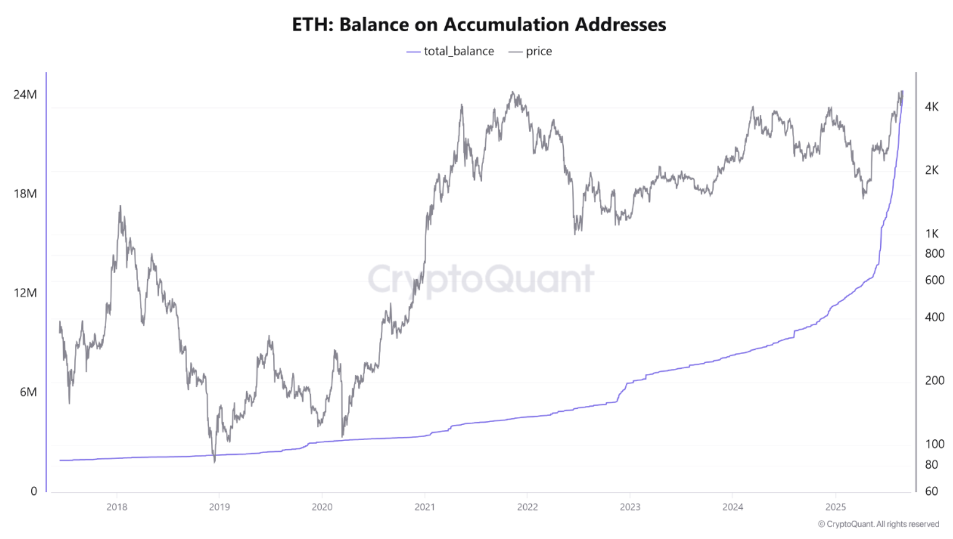 이더리움을 매도하지 않고 장기적으로 매집하는 주소(Accumulation Address)의 보유 물량이 사상 최대치를 경신했다. 크립토퀀...