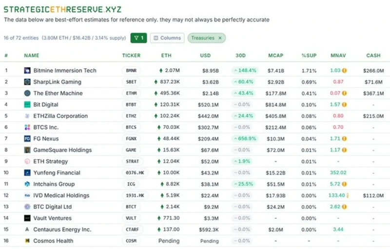 이더리움(ETH)을 비축 자산으로 지정한 이더리움 트레저리 기업들의 순자산가치 비율(mNAV)이 1 미만으로 하락한 것으로 나타났다. mNAV는 기업의 시장 가치를 순자산가치(NAV)로 나눈 값이다. 9일(한