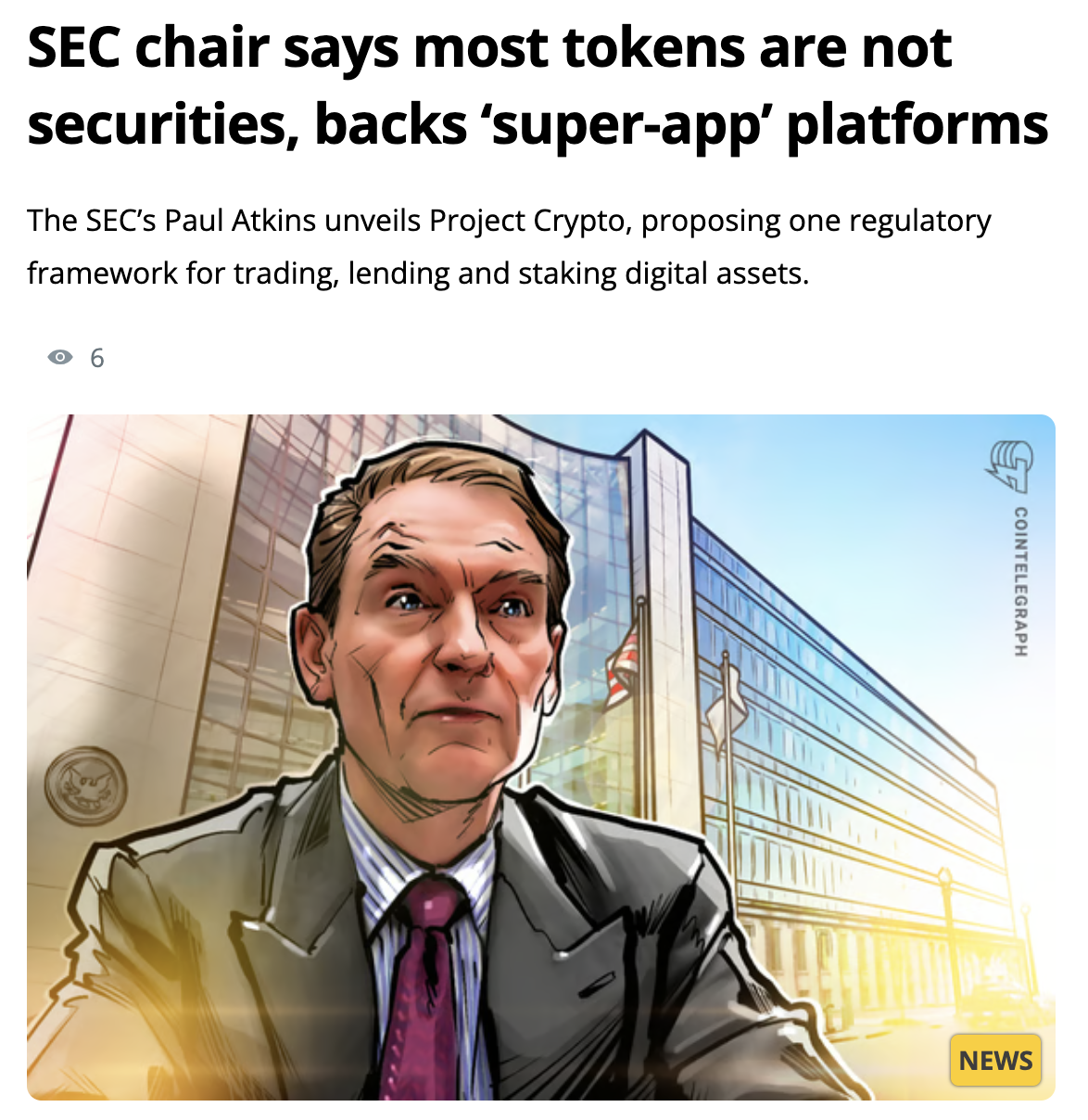 폴 앳킨스 미국 증권거래위원회(SEC) 위원장이 대부분의 암호화폐 토큰은 증권이 아니라고 재차 강조하면서 “SEC는 과거...
