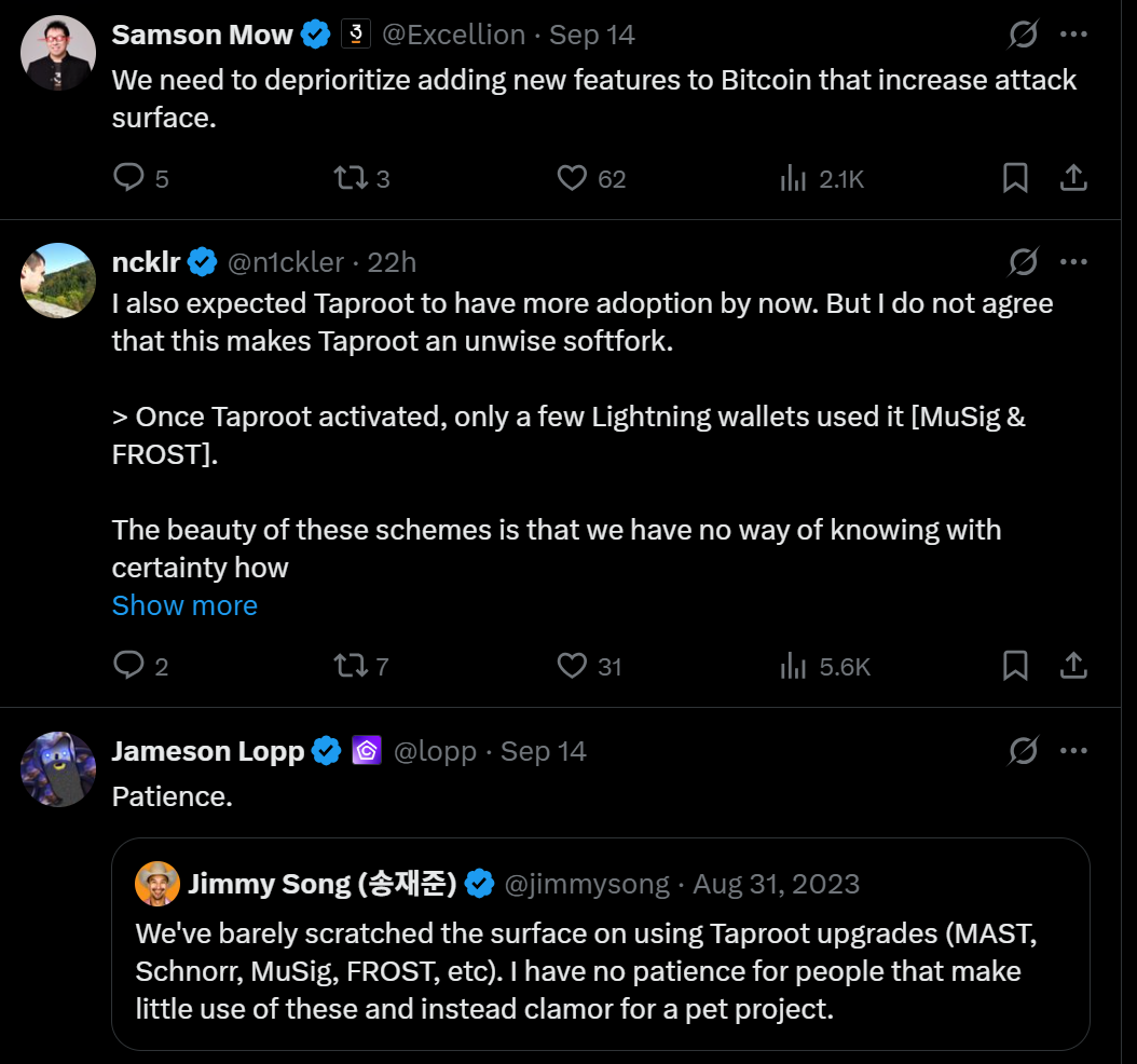 비트코인 탭루트 논쟁 재점화…지미 송 "기대만큼 안 써" vs "이득 없다고 비난하는가" | 블록미디