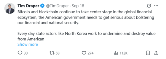 팀 드레이퍼가 비트코인과 블록체인이 글로벌 금융과 국가 안보의 핵심 인프라로 떠오르고 있으며, 미국 정부는 이를 적극 수용해야 한다고 강조했다. 그는 비트코인 가격이 25만달러까지 오를