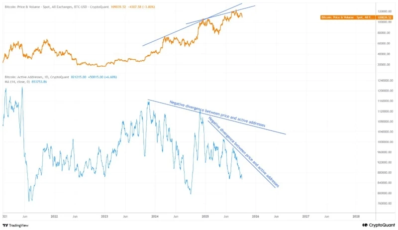 - 가격은 수개월째 고점을 경신 중이나, 활성 주소 수는 감소하거나 정체된 상태.