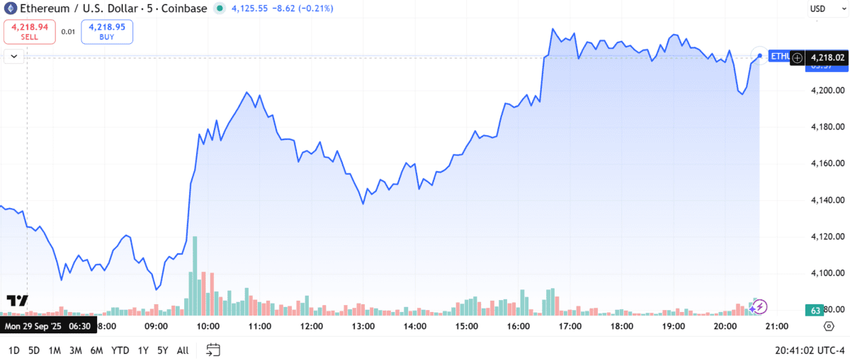 - ETH 가격 회복: 2025년 9월 30일 기준, 코인베이스에서 ETH/USD는 4,211달러에 거래 중.