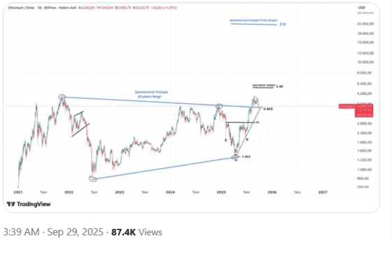- 분석가 크립토젬은 이더리움이 4년간 이어진 대칭삼각형 패턴을 상향 돌파했다고 분석.