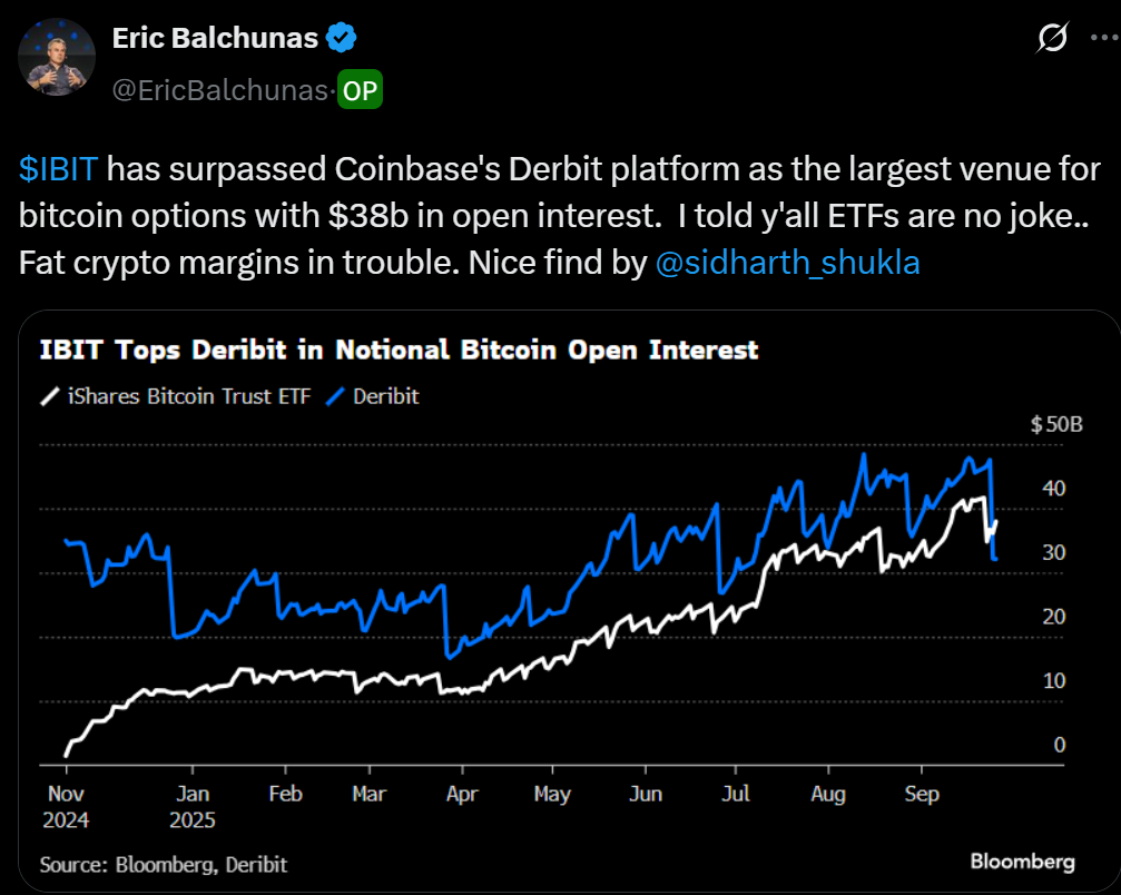 - 9월부터 IBIT 옵션 거래가 데리빗을 앞서기 시작했고, 격차는 점차 확대 중.