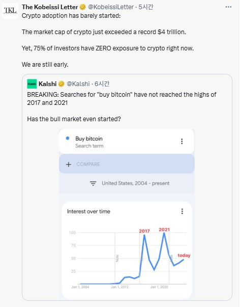 암호화폐 시장이 사상 최초로 4조달러의 시가총액을 기록하고 있지만 개인 투자자의 관심은 여전히 제한적인 수준에 머물고 있는 것으로 나타났다. 시장 전문 계정 코베이시레터(The Kobeissi Letter