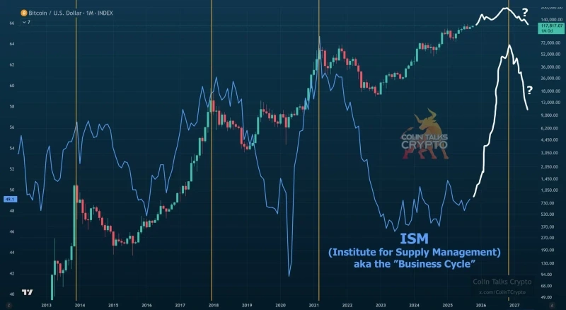 ISM 제조업 PMI와 비트코인 사이클의 관계에 대한 분석 내용을 정리한 요약입니다:
