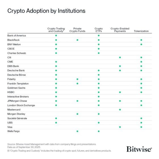 - 비트와이즈가 2025년 9월 30일 기준으로 공개한 자료에 따르면, 블랙록, JP모건, 골드만삭스, 피델리티 등 주요 월가 기관들이 이미 암호화폐 사업에 참여 중
