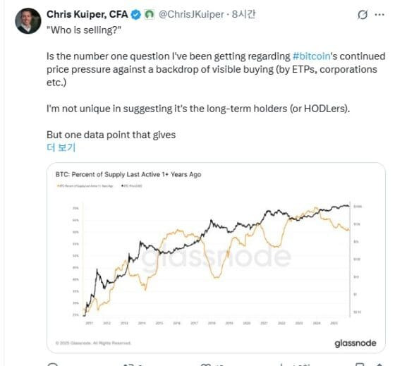 최근 비트코인(BTC)이 ETF와 기업들의 '보이는 매수'에도 불구하고 지속적인 하락 압력을 받는 배경은 장기 보유자들의 매도가 원인이라는 분석이 제기됐다. 크리스 쿠이퍼(Chris Kuiper) 피델리티 디