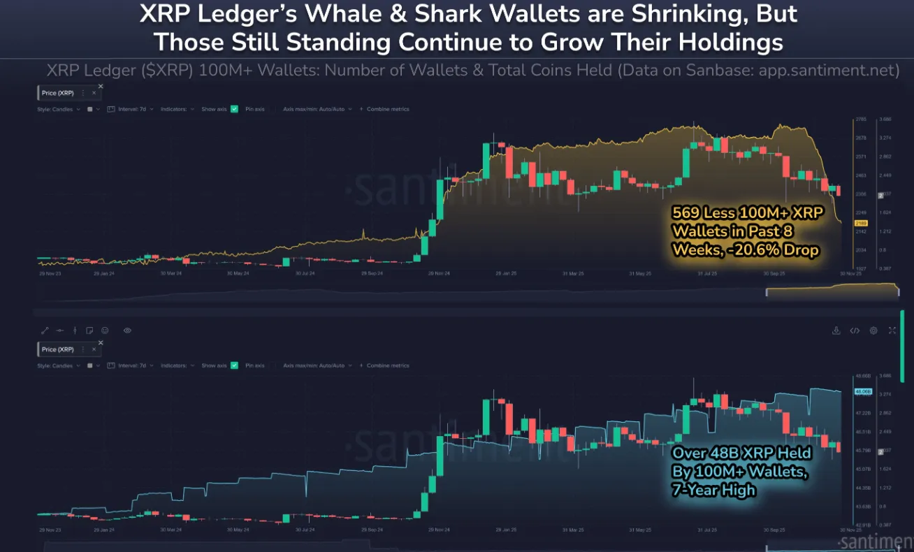 - 1억 XRP 이상 보유한 고래 주소 수는 8주 전 대비 20.6% 줄어듦.