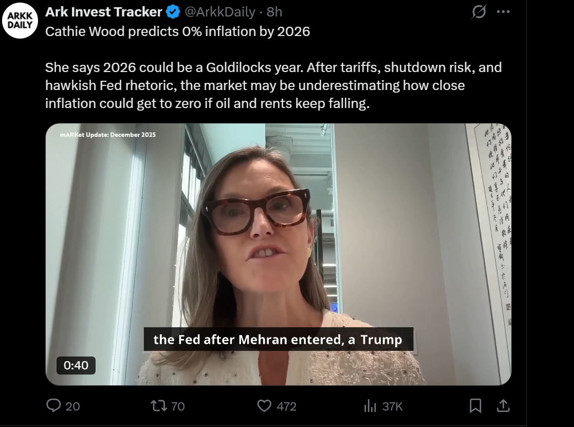 즉, 캐시 우드는 낙관적 디플레이션 전망을 제시하며, 2026년을 경기 과열도 침체도 아닌 이상적인 경제 상황으로 규정했지만, 연준의 신중한 입장과 조건부 요인이 변수로 남아 있습니다.