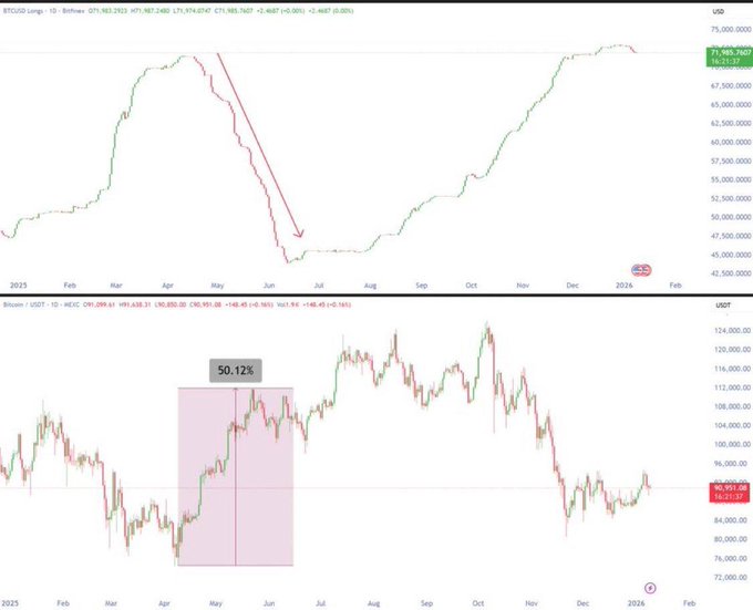 - 2024년 4월 롱 포지션 감소 시작 → BTC/USD 저점(7만5000달러 이하)과 일치.