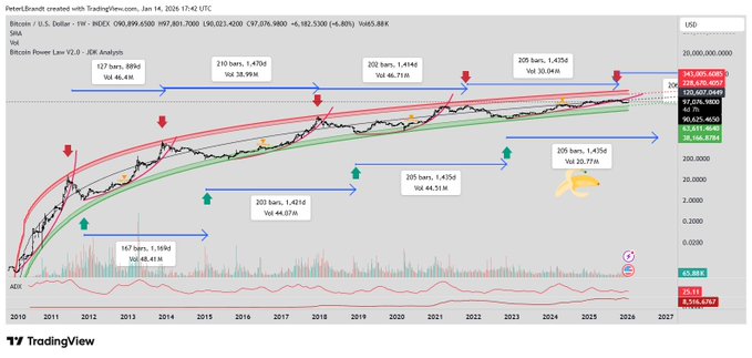 - 1월 14일(현지시간) X를 통해 비트코인 장기 추세 분석 차트 공개