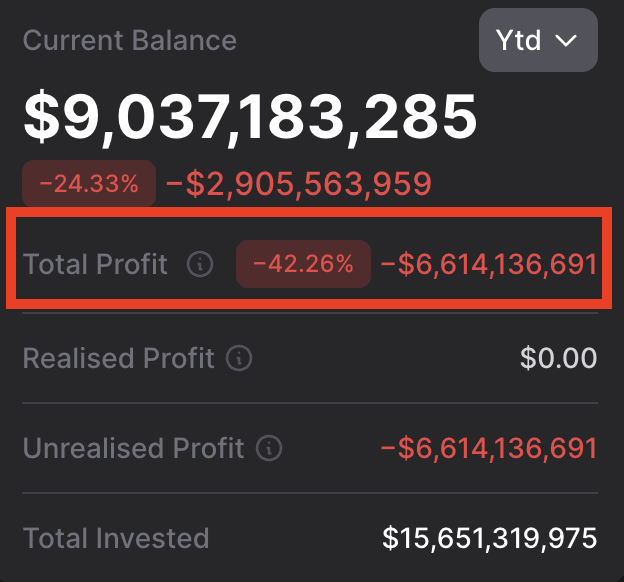 - 누적 손익은 –42.26%, 손실 규모 약 66억1413만 달러(약 9조5700억 원).
