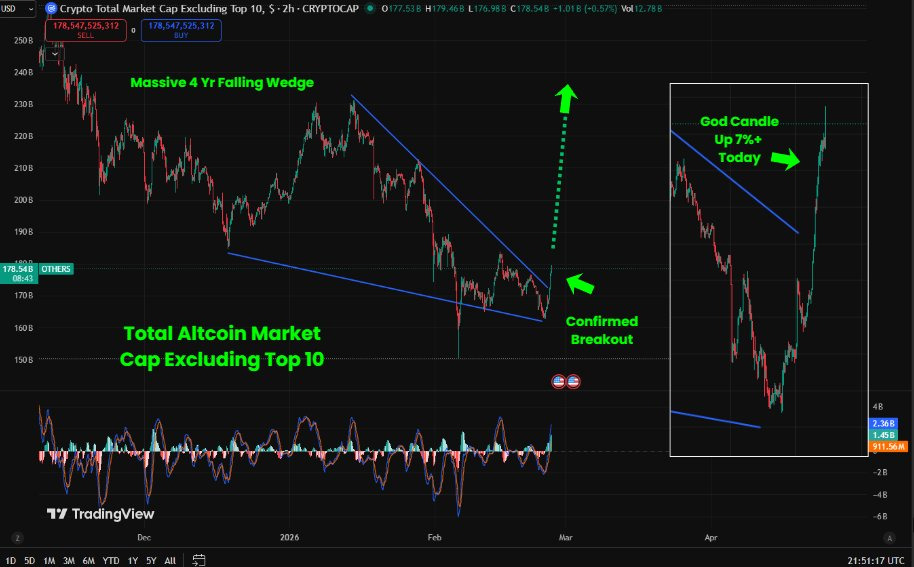 - 알트코인: 상위 10개 코인을 제외한 전체 시가총액이 4년간 이어진 하락 패턴을 돌파. 하루 7% 이상 급등하며 “구조적 돌파”라는 평가.