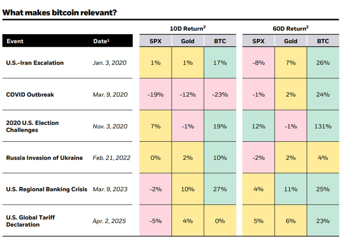 - 지정학적 충격 발생 후 10일간, 비트코인은 금(Gold)보다 강력한 헤지 수단
