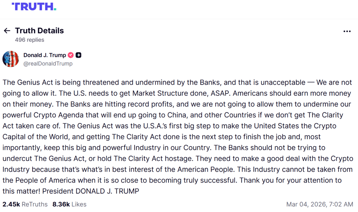 도널드 트럼프 미국 대통령이 암호자산 시장 구조 법안(CLARITY Act) 처리 촉구 메시지를 거듭 내놓으며 전통 은행권과의 갈등이 심화하고 있다. 대통령은 소셜미디어 트루스소셜을 통해 “법안 처