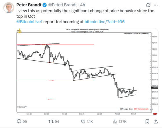 - 기술적 진단: 반면 베테랑 트레이더 피터 브랜트는 최근 가격 행동이 지난해 10월 고점 이후와는 다른 양상을 보이고 있다고 평가했습니다. 그는 급락 이후 매도 압력과 변동성의 구조가 달라지고 있다는 점에 주목했습니다.