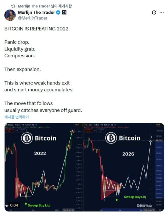 현재 비트코인(BTC)의 가격 흐름이 2022년 바닥을 다지고 급등하기 직전의 패턴을 그대로 반복, 대규모 폭등이 임박했다는 분석이 나왔다. 디지털자산(가상자산) 분석가 '멀린 더 트레이더(Merlijn Th