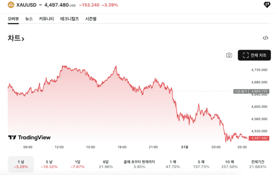 - 금 가격이 최근 한 달간 약 7.67% 하락해 4,497달러 수준