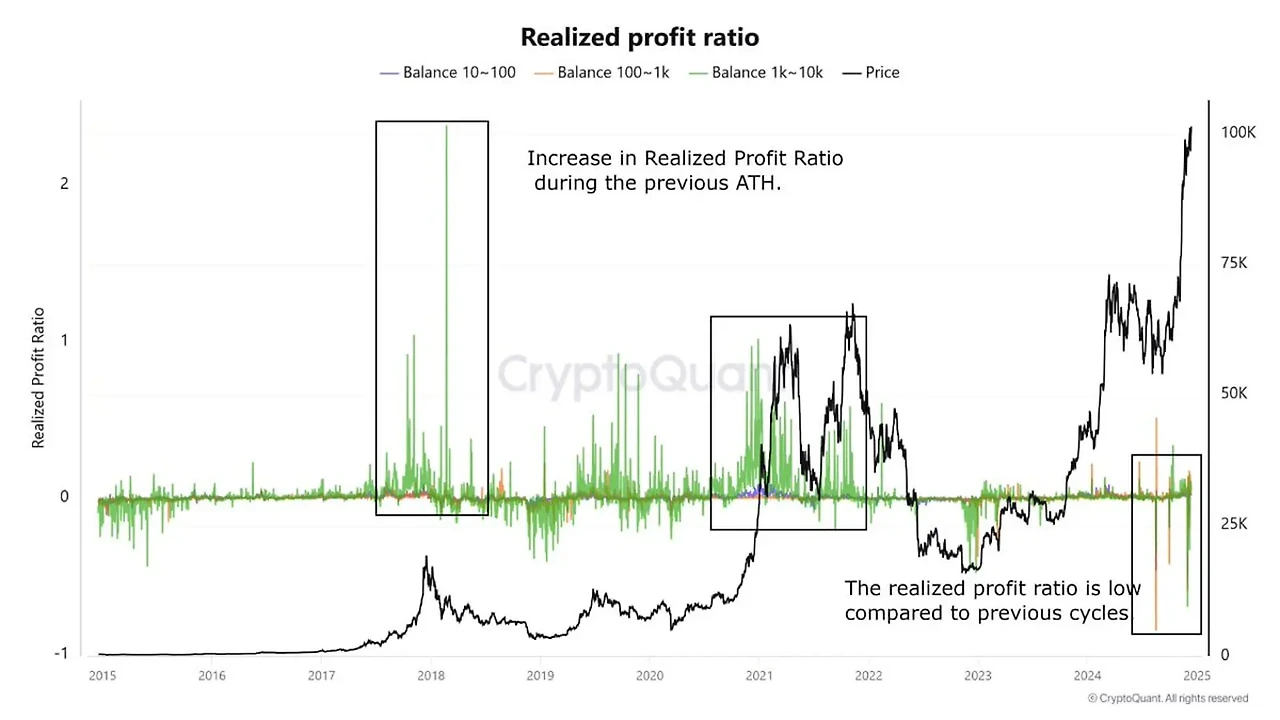 온체인 데이터 분석 플랫폼 크립토퀀트(CryptoQuant)에 따르면, 비트코인 실현 이익 비율은 고래들의 이익 실현 및 시장 이탈 여부를 판단하는 중요한 지표입니다. 비트코인을 1000개에서 1만 개 보유한 고래 지갑의 실현 이익을 보면, 이익 실현 과정이 아직 본격적으로 시작되지 않았음을 알 수 있습니다. 이는 고래들이 비트코인의 추가 상승을 기다리고 있다는 것을 시사합니다.