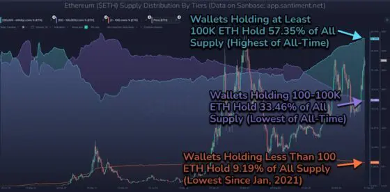 - 산티멘트(Santiment) 데이터에 따르면, 10만 ETH 이상을 보유한 '메가 웨일' 그룹이 이더리움 총 공급량의 57% 이상을 보유하고 있습니다.