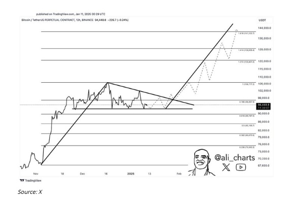 5. **불 페넌트 패턴**: 알리 디지털자산 분석가는 현재 비트코인이 불 페넌트 패턴을 형성하고 있으며, 추가 상승을 준비하고 있다고 분석했습니다. 이 패턴이 유지된다면 비트코인은 14만 달러를 목표로 할 수 있습니다.